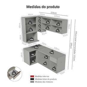 - 52 cm de profundidade nos balcões, 31 cm nos aéreos e 45 cm no nicho para micro-ondas