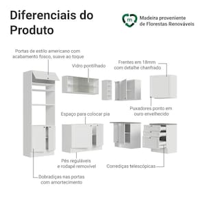 O acabamento de alta resistência da estrutura e das frentes é em Branco e possui uma textura suave ao toque. O destaque fica por conta dos puxadores ponto em ouro envelhecido, feitos com metal resistente, trazem personalidade e um charme único. Outro diferencial está no detalhe chanfrado das frentes, que forma molduras elegantes e dá profundidade ao design.