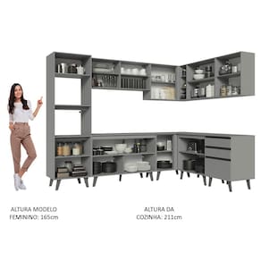 Itens inclusos: - Uma (1) Torre Quente de 60 cm com duas (2) portas e dois (2) nichos para fornos - Um (1) Aéreo de 120 cm com duas (2) portas - Um (1) Balcão de 120 cm duas (2) portas e tampo - Um (1) Aéreo de Canto com uma (1) porta e adega acoplada - Um (1) Balcão de Canto com uma (1) porta e tampo - Dois (2) Aéreos de 80 cm com uma (1) porta basculante cada - Um (1) Balcão de 80 cm com duas (2) portas e tampo - Um (1) Aéreo de 60 cm com uma (1) porta - Um (1) Balcão de 60 cm com três (3) gavetas e tampo