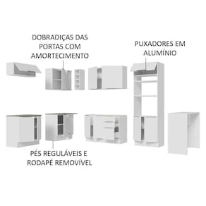 Composta por materiais de qualidade e pensados para garantir durabilidade, a cozinha conta com puxadores em alumínio no modelo slim, gavetas com corrediças telescópicas de abertura total e as portas com amortecimento para fechamento suave.