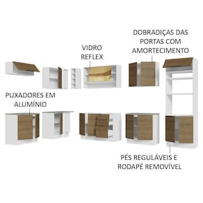 O acabamento da estrutura é branco e o das portas e frentes é em amadeirado Rustic. São feitos em Pintura Poliéster ecológica, que protege o móvel dos efeitos da água e do calor.