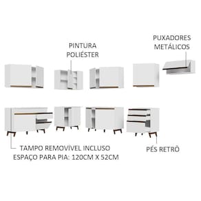 Fabricada com materiais e processos de alta qualidade, possui acabamento branco em Pintura Poliéster ecológica, corrediças e dobradiças metálicas, puxadores em alumínio e pés retrô em madeira maciça. Esses detalhes conferem beleza e aumentam a durabilidade do móvel.