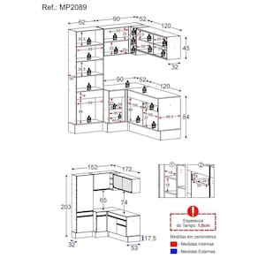 Dimensões do produto montado: Altura: 203cm | Largura: 152 x 172cm | Profundidade: 32cm (aéreos e paneleiro) - 53cm (balcão com tampo) *Você pode consultar as medidas internas na imagem técnica do produto. *As cores do produto podem sofrer variações de tonalidade de acordo com as configurações do seu dispositivo.