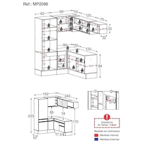Dimensões do produto montado: Altura: 203cm | Largura: 152 x 242cm | Profundidade: 32cm (aéreos) - 53cm (balcão com tampo e paneleiro) *Você pode consultar as medidas internas na imagem técnica do produto. *As cores do produto podem sofrer variações de tonalidade de acordo com as configurações do seu dispositivo.