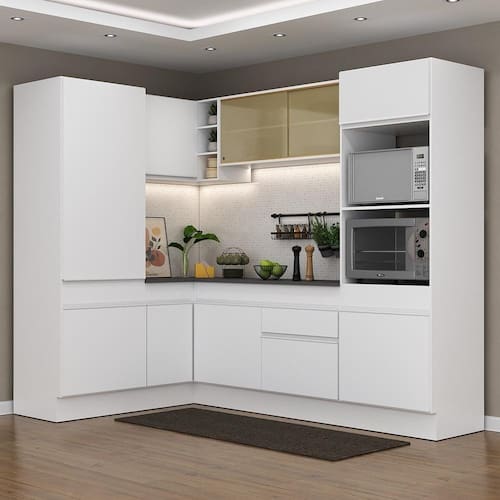 Conteúdo da Embalagem: 1 (um) paneleiro 62cm 1 (um) armário aéreo de canto 90cm 1 (um) armário aéreo com portas de vidro 120cm 1 (um) balcão com tampo de canto 90cm 1 (um) balcão com tampo 120cm 1 (um) armário para forno e microondas 62cm 1 (um) kit com rodapés