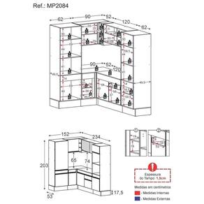 Dimensões do produto montado: Altura: 203cm | Largura: 152 x 234cm | Profundidade: 32cm (aéreos) - 53cm (balcão com tampo e paneleiro) *Você pode consultar as medidas internas na imagem técnica do produto. *As cores do produto podem sofrer variações de tonalidade de acordo com as configurações do seu dispositivo.