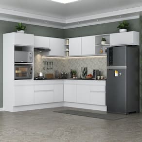 Conteúdo da Embalagem: 1 (um) armário para forno e microondas 62cm 1 (um) armário aéreo 70cm 1 (um) armário aéreo de canto 90cm 1 (um) armário aéreo 150cm 1 (um) balcão com tampo 70cm 1 (um) balcão com tampo de canto 90cm 1 (um) balcão com tampo 150cm 1 (um) armário aéreo 70cm 1 (um) kit com rodapés