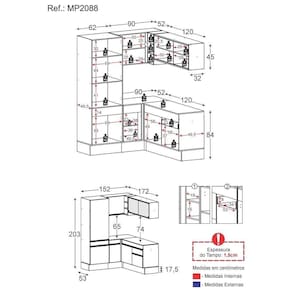 Dimensões do produto montado: Altura: 203cm | Largura: 152 x 172cm | Profundidade: 32cm (aéreos) - 53cm (balcão com tampo e paneleiro) *Você pode consultar as medidas internas na imagem técnica do produto. *As cores do produto podem sofrer variações de tonalidade de acordo com as configurações do seu dispositivo.