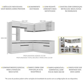 Dimensões do produto montado: Altura: 203cm | Largura: 222 x 202cm | Profundidade: 32cm (aéreos) - 53cm (balcão com tampo e paneleiro) *Você pode consultar as medidas internas na imagem técnica do produto. *As cores do produto podem sofrer variações de tonalidade de acordo com as configurações do seu dispositivo.