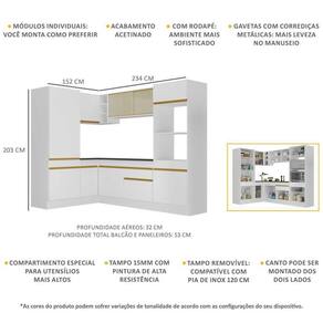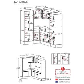 Altura: 203cm | Largura: 152 x 234cm | Profundidade: 32cm (aéreos) - 53cm (balcão com tampo e paneleiro)