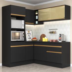 Conteúdo da Embalagem: 1 (um) armário para forno e microondas 62cm 1 (um) armário aéreo de canto 90cm 1 (um) armário aéreo com portas de vidro 120cm 1 (um) balcão com tampo de canto 90cm 1 (um) balcão com tampo 120cm 1 (um) kit com rodapés