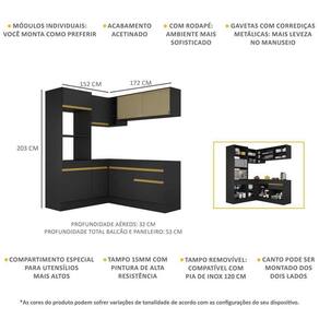 Dimensões do produto montado: Altura: 203cm | Largura: 152 x 172cm | Profundidade: 32cm (aéreos) - 53cm (balcão com tampo e paneleiro) *Você pode consultar as medidas internas na imagem técnica do produto.