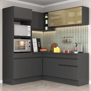 Conteúdo da Embalagem: 1 (um) armário para forno e microondas 62cm 1 (um) armário aéreo de canto 90cm 1 (um) armário aéreo com portas de vidro 120cm 1 (um) balcão com tampo de canto 90cm 1 (um) balcão com tampo 120cm 1 (um) kit com rodapés