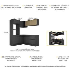 Dimensões do produto montado: Altura: 203cm | Largura: 152 x 172cm | Profundidade: 32cm (aéreos) - 53cm (balcão com tampo e paneleiro) *Você pode consultar as medidas internas na imagem técnica do produto. *As cores do produto podem sofrer variações de tonalidade de acordo com as configurações do seu dispositivo.