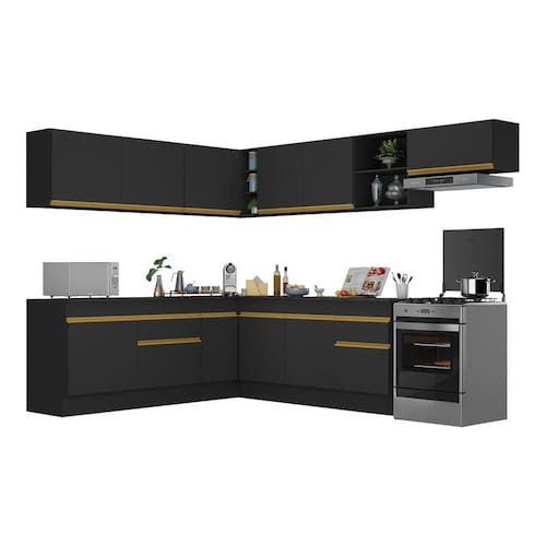 Conteúdo da Embalagem: 1 (um) armário aéreo 120cm 1 (um) armário aéreo de canto 90cm 1 (um) armário aéreo 150cm 1 (um) armário aéreo 70cm 1 (um) balcão com tampo 120cm 1 (um) balcão com tampo de canto 90cm 1 (um) balcão com tampo 150cm 1 (um) kit com rodapés
