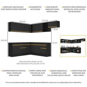 Dimensões do produto montado: Altura: 203cm | Largura: 210 x 272cm | Profundidade: 32cm (aéreos) - 53cm (balcão com tampo) *Você pode consultar as medidas internas na imagem técnica do produto.