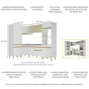 Dimensões do produto montado: Altura: 203cm | Largura: 152 x 234cm | Profundidade: 32cm (aéreos) - 53cm (balcão com tampo e paneleiro) *Você pode consultar as medidas internas na imagem técnica do produto.