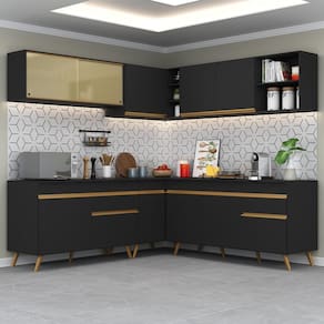 Conteúdo da Embalagem: 1 (um) armário aéreo com portas de vidro 120cm 1 (um) armário aéreo de canto 90cm 1 (um) armário aéreo 150cm 1 (um) balcão com tampo 120cm 1 (um) balcão com tampo de canto 90cm 1 (um) balcão com tampo 150cm