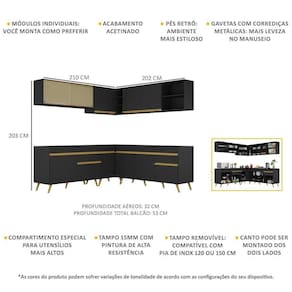 Dimensões do produto montado: Altura: 203cm | Largura: 210 x 202cm | Profundidade: 32cm (aéreos) - 53cm (balcão com tampo) *Você pode consultar as medidas internas na imagem técnica do produto.