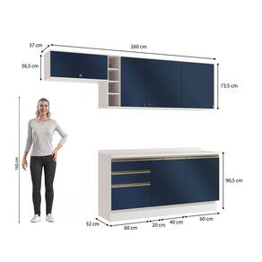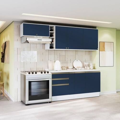 Acabamento: Pintura Brilho / Pintura Fosco / Pintura Touch | Cor: Branco/Azul Profundo | Corrediças: Telescópicas | Dobradiça: Com Amortecimento / Sem Amortecimento | E possivel montar o produto sem os pés?: Sim | Garantia: 3 meses para defeito de fabricação | Gavetas: Externas / Internas | Matéria-prima: MDF / MDP | Peso suportado por cada prateleira: 7 kg | Peso suportado por gaveta: 6 kg | Puxadores: Alumínio / Metálicos / Puxadores de Metal e de Alumínio | Quantidade de gavetas: 2 / 3 | Quantidade de portas: 1 | Quantidade de prateleiras: 1 / 5 | Sistema de montagem: Parafuso Philips | Tipo de porta: Bater | Duração da garantia: 3 meses | Tipo de garantia: Garantia do fabricante | Montagem: Necessita montagem | Tipo de móveis de cozinha: Combo de móveis de cozinha | Requer montagem: Sim