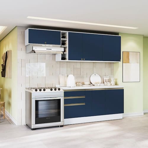 Transforme sua cozinha com toda a beleza e praticidade do Conjunto CB1411 da Cozinha Celeste Kappesberg. Produzido 100% em MDF de 15mm, o que garante mais robustez, firmeza e qualidade, além de um acabamento perfeito. São 2,30m de altura, 2,60m de largura e 52cm de profundidade nos balcões e 37cm nos aéreos. A caixaria é em pintura na cor branca e acabamento brilho, enquanto as frentes são na cor azul profundo, com acabamento fosco.