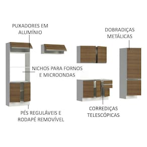 Para completar, acompanha pés reguláveis em PVC e rodapé removível em MDF, com encaixe fácil para retirar na hora de limpar a cozinha.