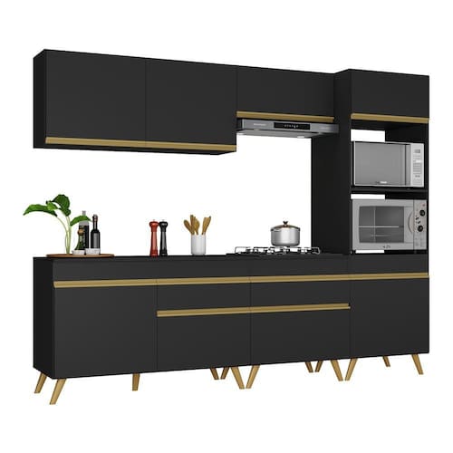 Conteúdo da Embalagem: 1 (um) armário aéreo 120cm 1 (um) balcão com tampo 120cm 1 (um) armário aéreo 70cm 1 (um) balcão com tampo 70cm 1 (um) paneleiro 62cm
