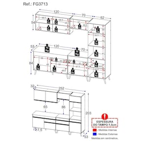 Dimensões do produto montado: Altura: 203cm | Largura: 252cm | Profundidade: 32cm (aéreos) - 53cm (balcão com tampo e paneleiro) *Você pode consultar as medidas internas na imagem técnica do produto.