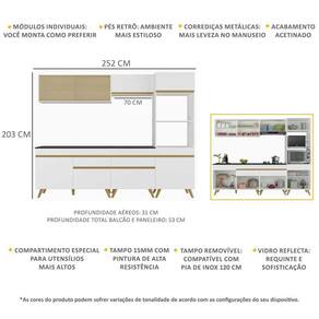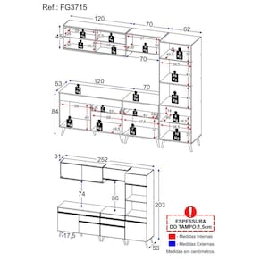 Dimensões do produto montado: Altura: 203cm | Largura: 252cm | Profundidade: 31cm (aéreos) - 53cm (paneleiro e balcão com tampo) *Você pode consultar as medidas internas na imagem técnica do produto.