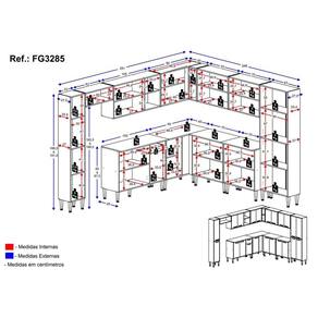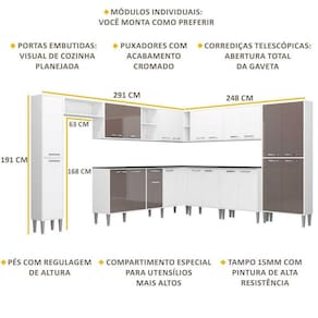 Altura: 191 cm / Largura: 291 x 248 cm / Profundidade: 27,5 cm (aéreos e paneleiro) - 45 cm (balcão com tampo) / Espaço do nicho para fogão/geladeira: Altura: 168 cm - Largura: 63 cm