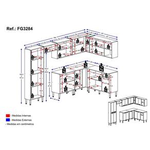 Dimensões do produto montado: Cozinha: Altura: 191 cm - Largura: 286 x 150 cm - Profundidade: 27,5 cm (aéreos e paneleiro) - 45 cm (balcão com tampo) Espaço do nicho para fogão/geladeira: Altura: 168 cm - Largura: 63 cm *Você pode consultar as medidas internas na imagem técnica do produto.