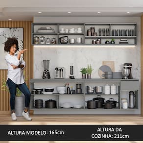 O acabamento da cozinha é cinza, feito em Pintura Poliéster ecológica, que oferece proteção contra os efeitos da água e do calor.