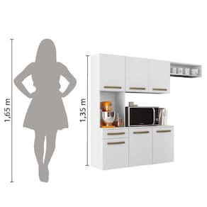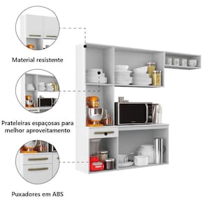 O Armário de Cozinha Completa Suspenso Belíssima traz qualidade, elegância e praticidade para o seu dia a dia. Contém 6 portas com prateleiras bem divididas para melhor aproveitamento do espaço, armário aéreo com nicho organizador, puxadores modernos e balcão com tampo que se torna uma excelente bancada para acomodar seus utensílios de cozinha. Com muita funcionalidade, vai deixar seu lar ainda mais bonito.