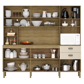 Com altura de 204,5 cm, largura de 222,2 cm e profundidade de 46,8 cm garantem que a cozinha Intense seja uma das maiores do mercado de Kits e cozinhas práticas. E o melhor: a instalação e a montagem são rápidas e fáceis, sem precisar furar a parede para fixação, o que faz toda a diferença para para você. Além disso, a cozinha prática Intense conta com 3 nichos decorativos que permitem personalizar a decoração da cozinha e guardar itens do dia a dia, deixando o ambiente ainda mais bonito e funcional. E não podemos esquecer do nicho para forno elétrico ou micro-ondas, com um espaço amplo para garantir a praticidade na hora de cozinhar e utilizar no dia a dia. Mas não é só isso. As duas amplas gavetas com corrediças telescópicas são um verdadeiro show à parte, proporcionando um deslize suave e sem esforço, sem contar que são super espaçosas e garantem a organização dos utensílios da cozinha.Os pés com regulagem, os puxadores em ABS com pintura inox e as portas em 15 mm de espessura garantem resistência e durabilidade, além de um design moderno e sofisticado.