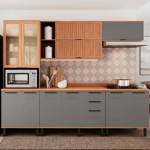Cor: Freijó com Cinza | Inclui manual de montagem: Sim | Materiais do corpo: MDP | Requer Montagem: Sim | Tipo de móveis de cozinha: Cozinha Completa