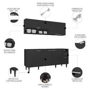 O Armário Aéreo 100cm conta com uma porta basculante com pistão a gás e dois nichos, enquanto o Armário Aéreo 80cm vem com duas portas convencionais, com uma prateleira interna para auxiliar na organização dos seus utensílios de forma prática e eficiente. Já o Balcão Para Pia dispõe de quatro portas e duas gavetas, com uma prateleira interna que oferece amplo espaço de armazenamento. Todos os móveis possuem estrutura em MDP 15mm, com acabamento em BP, puxadores em alumínio, dobradiças e corrediças metálicas, que garantem máxima resistência no uso diário. Os pés em PVC, são reguláveis, permitindo ajustar pequenos desníveis de piso. O balcão não acompanha tampo para que o uso fique opcional com tampo ou pia. Este Armário de Cozinha é a solução ideal para otimizar sua casa, combinando materiais de alta qualidade com um design sofisticado.