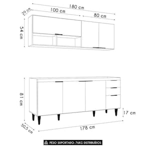 Peso Suportado Distribuído: Balcão 36 Kg / Armário 100cm: 20 Kg / Armário 80cm: 20 Kg.