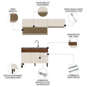 O Armário Aéreo possui três portas basculantes, sendo uma delas com vidro reflecta, que proporciona um design moderno. Equipado com dobradiças metálicas e pistão a gás, ele garante uma abertura suave e controlada. Já o Balcão de Cozinha conta com três portas, também com dobradiças metálicas e amortecedor, além de duas gavetas com corrediças telescópicas e puxadores em poliestireno. Com amplo espaço interno, o Armário oferece excelente capacidade para armazenar utensílios como panelas, louças e muito mais, mantendo tudo sempre organizado de forma eficiente. Produzido em MDP 15mm, apresenta acabamento em pintura fosca texturizada na estrutura e acetinada nas portas. O processo de secagem com luzes UV confere um toque sofisticado ao Armário de Cozinha, aumentando sua resistência e durabilidade. A Pia Inox conta com um design funcional, que tem ótimo desempenho no escoamento da água e possibilita o uso de diferentes objetos sobre ela. Os pés, também em poliestireno, são reguláveis, permitindo ajustar pequenos desníveis de piso e manter a estabilidade do produto.