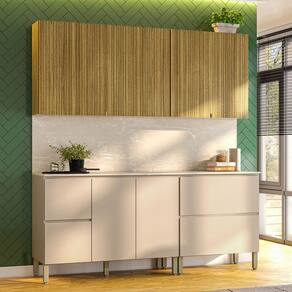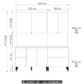 Conteúdo da Embalagem: 1 Armário Aéreo 80cm, 1 Armário Aéreo 120cm, 1 Balcão com Tampo 80cm, 1 Balcão 120cm, 1 Tampo.