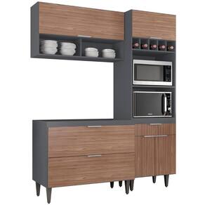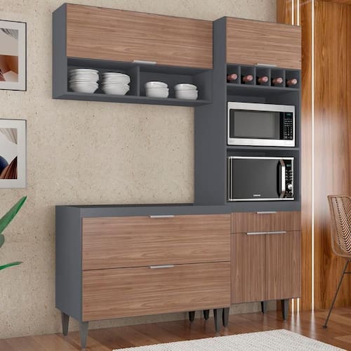 O Paneleiro conta com dois compartimentos para acomodar micro-ondas e forno elétrico, e cinco nichos na parte superior. Ele também inclui três portas, sendo uma delas basculante, além de uma gaveta. O Armário Aéreo vem com uma porta basculante com pistão a gás e dois nichos, para auxiliar na organização dos seus utensílios de forma prática e eficiente. Já o Balcão Para Pia dispõe de duas portas basculantes com fecho trava de , que permite o fechamento com um simples toque. Todos os móveis possuem estrutura em MDP 15mm, com acabamento em BP, puxadores em alumínio, dobradiças e corrediças metálicas, que garantem máxima resistência no uso diário. Os pés em PVC, são reguláveis, permitindo ajustar pequenos desníveis de piso. O balcão não acompanha tampo para que o uso fique opcional com tampo ou pia. Este Armário de Cozinha é a solução ideal para otimizar sua casa, combinando materiais de alta qualidade com um design sofisticado.