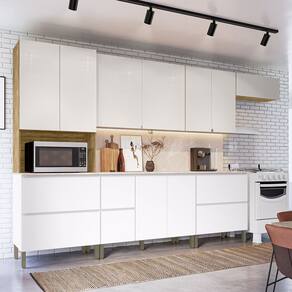 Conteúdo da Embalagem: 1 Armário Aéreo Basculante 80cm, 1 Armário Aéreo 80cm, 1 Armário Aéreo 120cm, 1 Balcão 80cm com tampo, 1 Balcão 120cm, 1 Tampo 120cm, 1 Paneleiro.