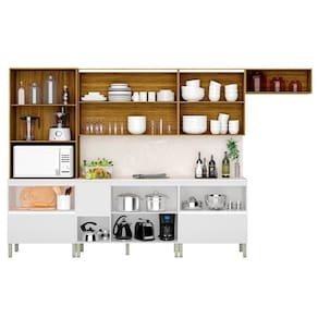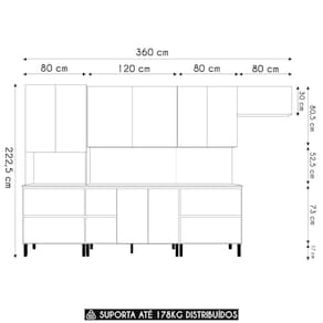Conteúdo da Embalagem: 1 Armário Aéreo Basculante 80cm, 1 Armário Aéreo 80cm, 1 Armário Aéreo 120cm, 1 Balcão 80cm com tampo, 1 Balcão 120cm, 1 Tampo 120cm, 1 Paneleiro.