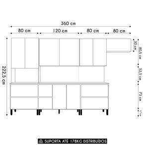 Conteúdo da Embalagem: 1 Armário Aéreo Basculante 80cm, 1 Armário Aéreo 80cm, 1 Armário Aéreo 120cm, 1 Balcão 80cm com tampo, 1 Balcão 120cm, 1 Tampo 120cm, 1 Paneleiro.