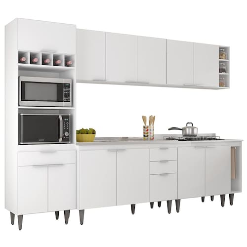 Conteúdo da Embalagem: 1 Armário Aéreo 120cm, 1 Armário Aéreo 80cm, 1 Balcão 118cm, 1 Balcão 80cm, 1 Balcão Porta Pano, 1 Paneleiro, 1 Nicho Adega, 1 Pia.