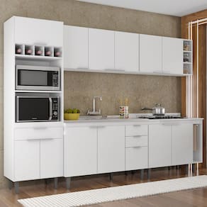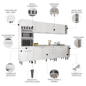 O Paneleiro conta com dois compartimentos para acomodar micro-ondas e forno elétrico, e cinco nichos na parte superior. Ele também inclui três portas, sendo uma delas basculante, além de uma gaveta para melhor organização dos seus utensílios. Os Armários Aéreos dispõe de cinco portas e duas prateleiras internas, oferecendo praticidade e estilo. O Balcão Gabinete e o Balcão 80cm com Tampo possuem cinco portas e duas gavetas, com duas prateleiras internas que proporcionam amplo espaço de armazenamento. Já o Balcão Porta Pano traz um suporte de aço para guardanapos e o nicho adega que conta com três repartições. Todos os móveis possuem estrutura em MDP 15mm, com acabamento em BP, puxadores em alumínio, dobradiças e corrediças metálicas, que garantem máxima resistência no uso diário. A Pia Inox apresenta um design ideal, que tem excelente desempenho no escoamento da água e possibilita o uso de diferentes objetos sobre ela. Os pés em PVC, são reguláveis, permitindo ajustar pequenos desníveis de piso. Este Armário de Cozinha é a solução perfeita para otimizar sua casa, combinando elegância e materiais de alta qualidade.