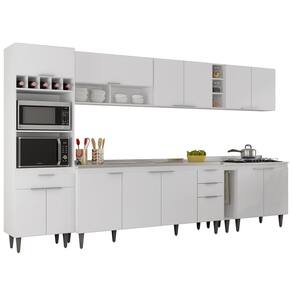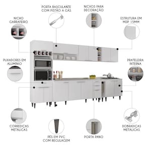 O Paneleiro conta com dois compartimentos para acomodar micro-ondas e forno elétrico, e cinco nichos na parte superior. Ele também inclui três portas, sendo uma delas basculante, além de uma gaveta para melhor organização dos seus utensílios. Os Armários Aéreos dispõe de quatro portas convencionais, uma porta basculante com pistão a gás, dois nichos e duas prateleiras internas, agregando praticidade e estilo. O Balcão gabinete e o Balcão 80cm com Tampo possuem seis portas e duas gavetas, com duas prateleiras internas que oferecem amplo espaço de armazenamento. Já o Balcão Porta Pano traz um suporte de aço para guardanapos e o nicho adega que conta com três repartições. Todos os móveis possuem estrutura em MDP 15mm, com acabamento em BP, puxadores em alumínio, dobradiças e corrediças metálicas, que garantem máxima resistência no uso diário. A Pia Inox apresenta um design ideal, que tem excelente desempenho no escoamento da água e possibilita o uso de diferentes objetos sobre ela. Os pés em PVC, são reguláveis, permitindo ajustar pequenos desníveis de piso. Este Armário de Cozinha é a solução perfeita para otimizar sua casa, combinando elegância e materiais de alta qualidade.