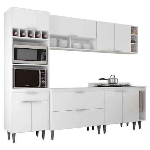 Conteúdo da Embalagem: 1 Armário Aéreo 100cm, 1 Armário Aéreo 80cm, 1 Balcão 98cm, 1 Balcão 80cm, 1 Balcão Porta Pano, 1 Paneleiro, 1 Nicho Adega.