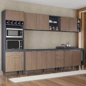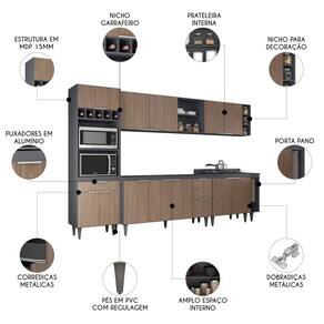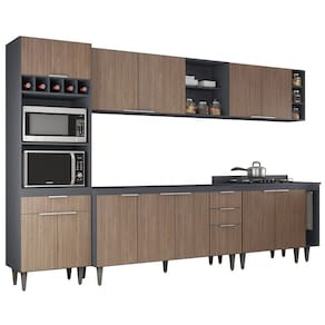 O Paneleiro conta com dois compartimentos para acomodar micro-ondas e forno elétrico, e cinco nichos na parte superior. Ele também inclui três portas, sendo uma delas basculante, além de uma gaveta para melhor organização dos seus utensílios. Os Armários Aéreos dispõe de quatro portas, dois nichos laterais e duas prateleiras internas, agregando praticidade e estilo. O Balcão Para Pia e o Balcão 80cm com Tampo possuem seis portas e duas gavetas, com duas prateleiras internas que oferecem amplo espaço de armazenamento. Já o Balcão Porta Pano traz um suporte de aço para guardanapos e o nicho adega que conta com três repartições. Todos os móveis possuem estrutura em MDP 15mm, com acabamento em BP, puxadores em alumínio, dobradiças e corrediças metálicas, que garantem máxima resistência no uso diário. Os pés em PVC, são reguláveis, permitindo ajustar pequenos desníveis de piso. O balcão gabinete não acompanha tampo para que o uso fique opcional com tampo ou pia. Este Armário de Cozinha é a solução ideal para otimizar sua casa, combinando materiais de alta qualidade com um design sofisticado.