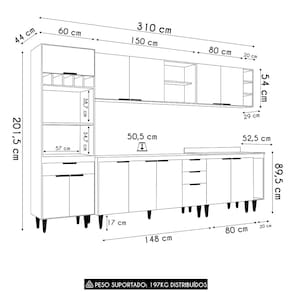 Conteúdo da Embalagem: 1 Armário Aéreo 150cm, 1 Armário Aéreo 80cm, 1 Balcão 148cm, 1 Balcão 80cm, 1 Balcão Porta Pano, 1 Paneleiro, 1 Nicho Adega.