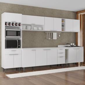O Paneleiro conta com dois compartimentos para acomodar micro-ondas e forno elétrico, e cinco nichos na parte superior. Ele também inclui três portas, sendo uma delas basculante, além de uma gaveta para melhor organização dos seus utensílios. Os Armários Aéreos dispõe de quatro portas convencionais, uma porta basculante com pistão a gás, dois nichos e duas prateleiras internas, agregando praticidade e estilo. O Balcão Para Pia e o Balcão 80cm com Tampo possuem seis portas e duas gavetas, com duas prateleiras internas que oferecem amplo espaço de armazenamento. Já o Balcão Porta Pano traz um suporte de aço para guardanapos e o nicho adega que conta com três repartições. Todos os móveis possuem estrutura em MDP 15mm, com acabamento em BP, puxadores em alumínio, dobradiças e corrediças metálicas, que garantem máxima resistência no uso diário. Os pés em PVC, são reguláveis, permitindo ajustar pequenos desníveis de piso. O balcão gabinete não acompanha tampo para que o uso fique opcional com tampo ou pia. Este Armário de Cozinha é a solução ideal para otimizar sua casa, combinando materiais de alta qualidade com um design sofisticado.